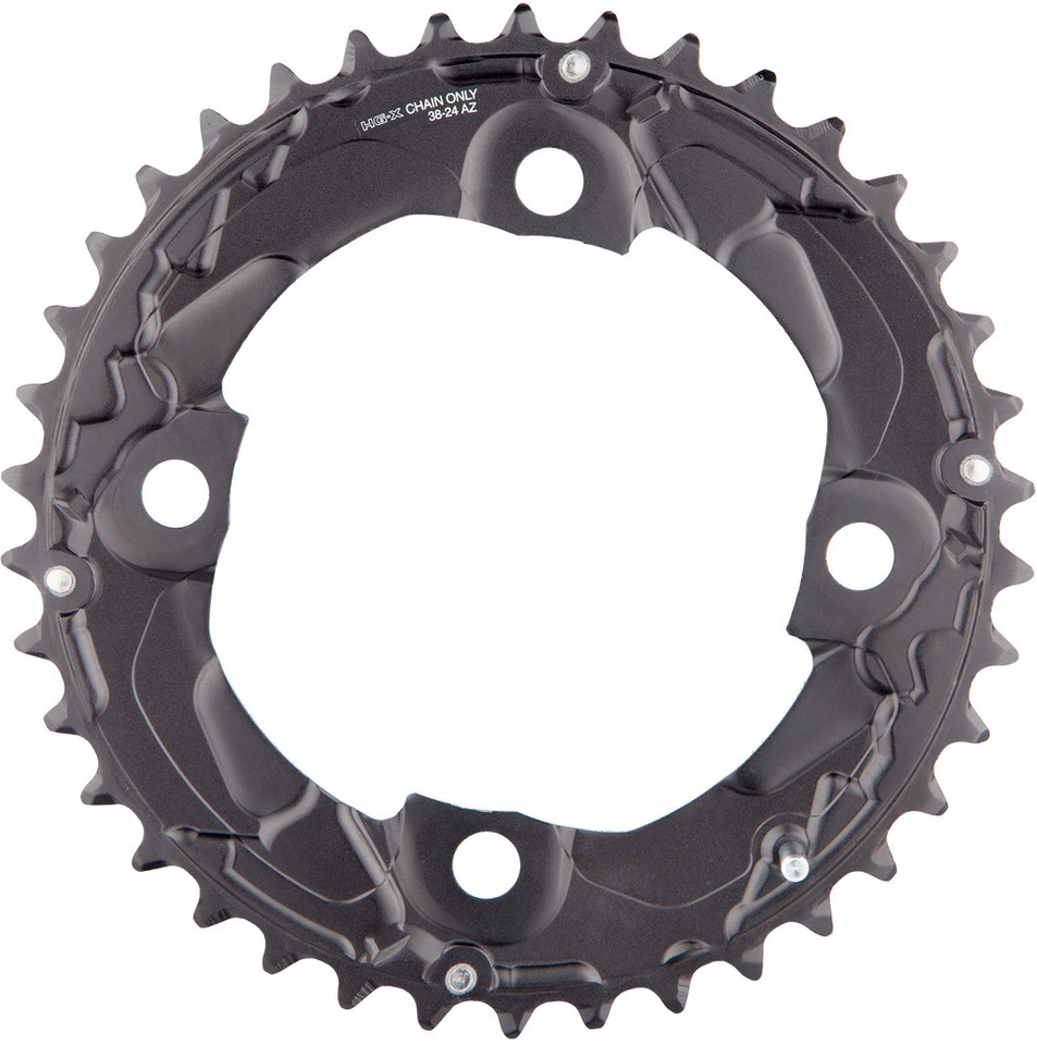 Spezifikationen:Einsatzbereich:All Mountain, Cross CountryBefestigung:104/64 mm Lochkreis, 4-ArmZähne:24 Z, 36 Z, 38 ZSchaltstufen:2×10-fachTechnische Daten:Kombinationsmöglichkeiten:22-36 Z, 24-38 ZMaterial:Stahl (24 Z), Aluminium (36 Z + 38 Z)Features:großes Kettenblatt eloxiert, kleines Kettenblatt plattiertAusführungen:24 Zähne: