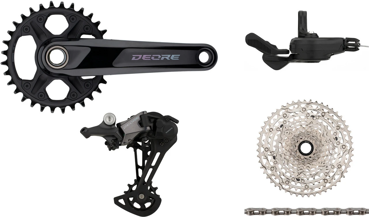 1 x Kurbelgarnitur Shimano Deore (FC-M6100-1) 32 Zähne1 x Schaltwerk Shimano Deore Shadow Plus (RD-M6100)1 x Schaltgriff Shimano Deore (SL-M6100)1 x Kassette Shimano Deore (CS-M6100-12)1 x Kette Shimano CN-M61001 x Abschlussring Shimano Stahl1 x Kettenschloss Shimano Quick-Link1 x Innenzug Shimano (2050 mm)1 x Außenhülle Shimano (1880 mm)3 x Endkappe 6 mm gedichtet1 x Endkappe verlängert