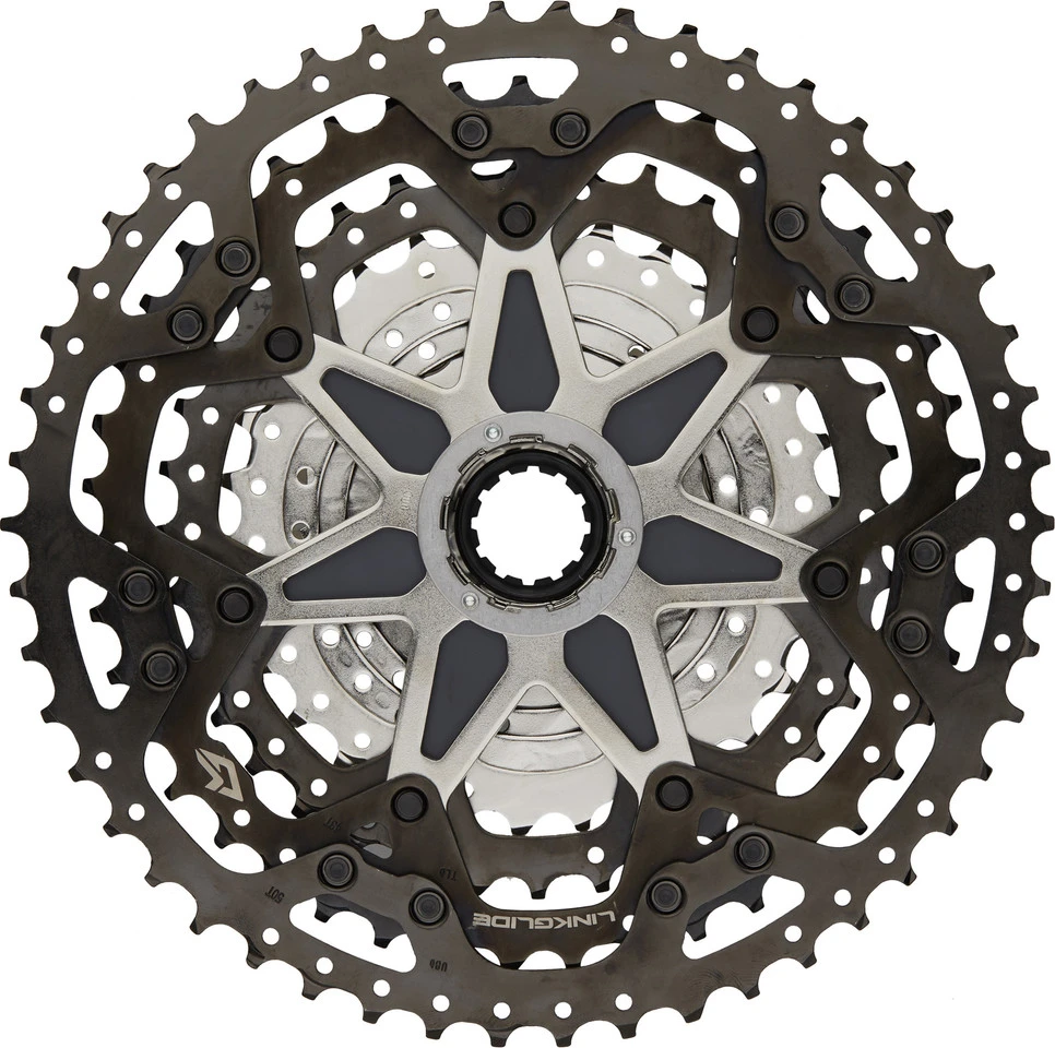 Die Ritzel von Linkglide-Kassetten verfügen über eine optimierte Zahnform und spezielle Zahnspitzen mit großen, tiefen Ausfräsungen auf der verdeckten Seite und schmalen Ausfräsungen auf der Antriebsseite. Zusammen mit der verbreiterten Zähnebasis bewirkt das nicht nur eine optimale Kettenbindung, es macht diese Kassetten auch dreimal so haltbar wie Hyperglide+-Kassetten und verringert Deformationen. In puncto Profil und Position überarbeitete Schalthilfen sorgen für geschmeidige Schaltvorgänge in beide Richtungen und reduzieren den Schaltruck, der aufgrund der hohen Kettenspannung bei E-Bikes gerade beim Schalten auf ein kleineres Ritzel gerne auftritt. Linkglide-Kassetten wurden für den täglichen Einsatz gemacht und widersetzen sich dem Verschleiß, der bei hohen Drehmomenten und beim monate- oder jahrelangen Fahren in ein- und demselben Gang zu erwarten wäre. Auch die Lebensdauer der Kette wird so verlängert und der Zeitpunkt, an dem sie aufgrund von Abnutzung zu schlagen beginnt, wird hinausgeschoben.